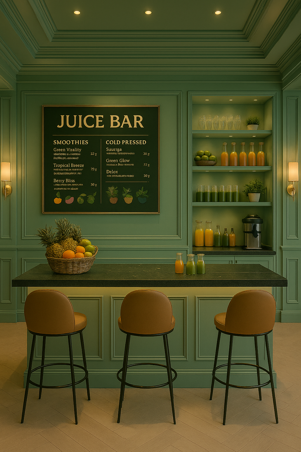An elegant dining destination where culinary artistry meets ambiance. Perfect for client lunches, celebratory bookings, or simply unwinding in luxury between sessions. Premier members enjoy preferred reservations and access to private dining areas.